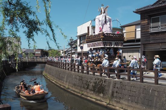 山車と小野川と観光船。いかにも佐原らしいショットと思います。