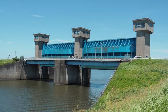 長豊橋を過ぎ、根木名川河口の水門(写真)に差し掛かります。この水門とその前後の350m