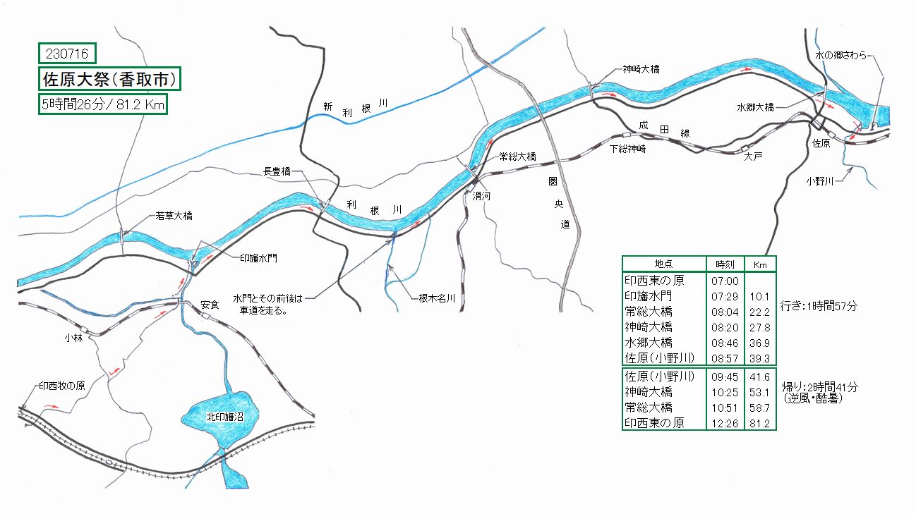 15日は強風が吹き荒れて出られず、結局16日に行ってきました。天候は晴れたのですが、香取市の最高気温37度との事で、熱中症に十分なり