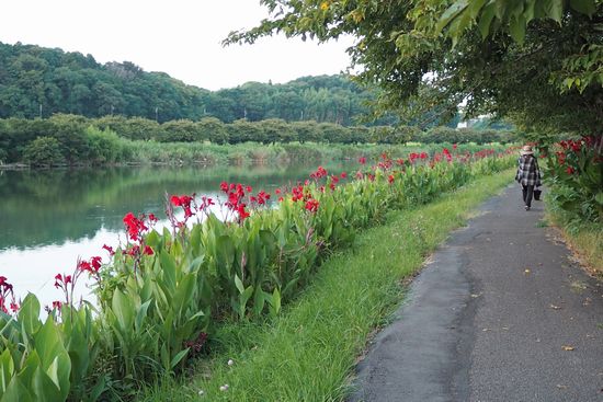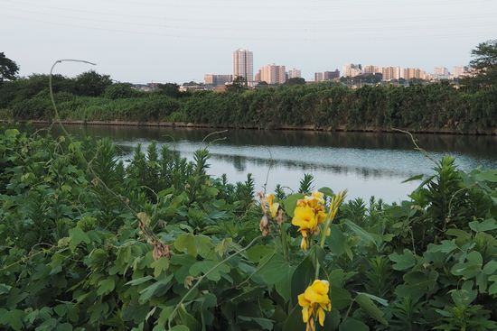 新川沿いにカンナが咲いています。私の好きな風景の一つ。