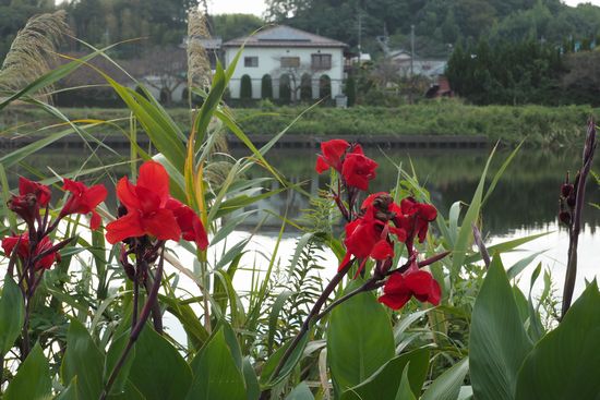 新川とカンナの花。ここで必ず撮る対象です。