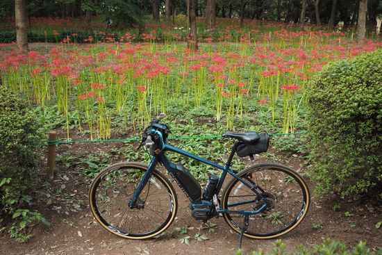 これは帰り道の新川サイクリングロード脇に咲いていた彼岸花。折からの陽射しを浴びて、明るい