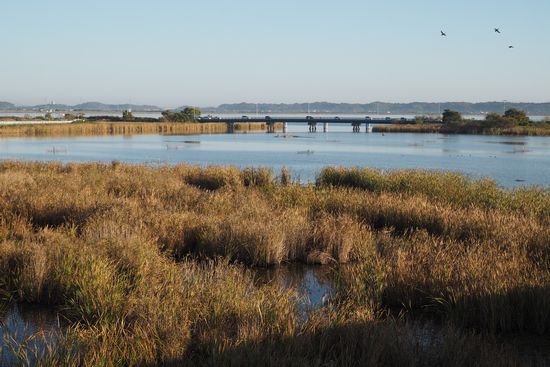 国道464からの北印旛沼と甚兵衛大橋の景色。葦がすっかり茶色になってきました。