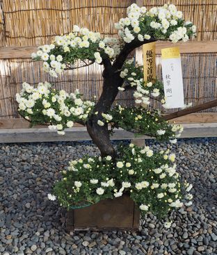 左は、小菊の盆栽作り。優等首席の札が付いていました。右は、黄色い小菊の懸崖作り。これは
