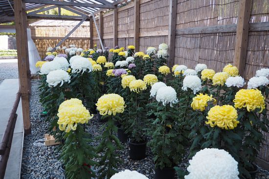 さて、菊花大会の見学です。境内に三ヶ所の展示場が設けられています。ここは大菊の三本仕立て。