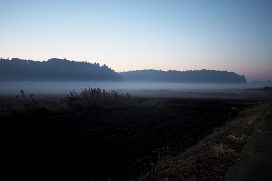 この季節、朝の6時はまだ暗いのです。いつもの師戸川谷津道には霧が漂っていました。