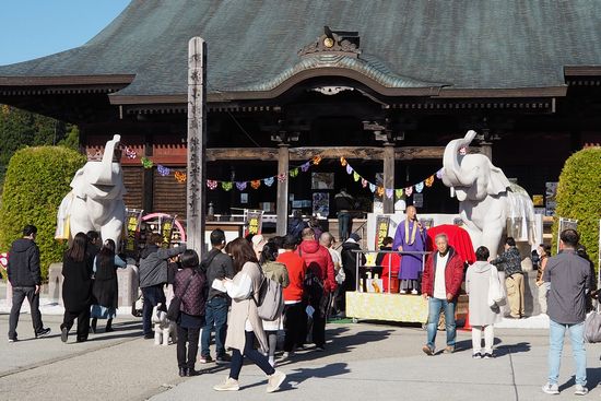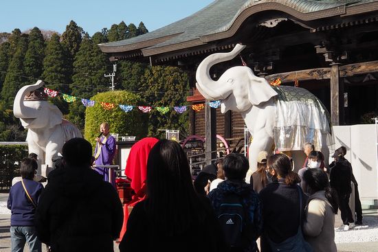 ご住職が吉ゾウくん(右)の前で説話を行っていました。左のゾウは結愛(ゆめ)ちゃんです。最近、テレビ