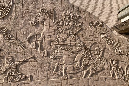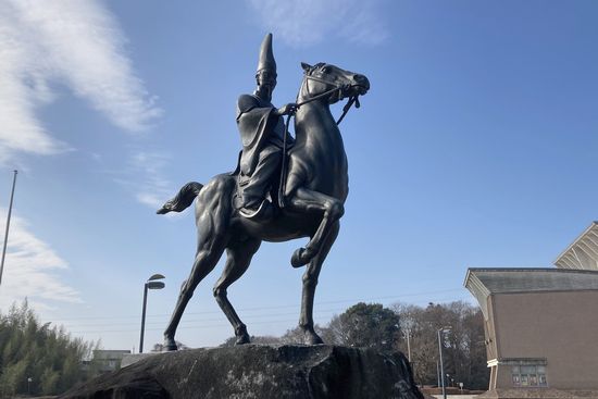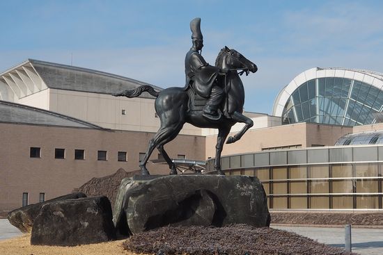 @ 坂東市の総合文化ホール前の広場の平将門公ブロンズ像。