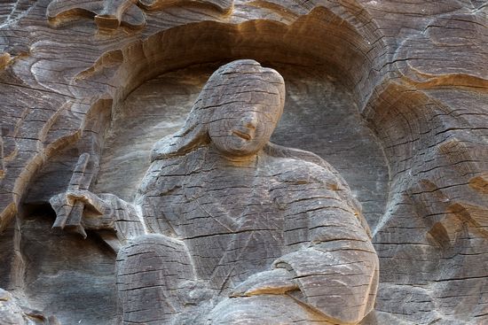右壁の彫刻の女性の右目が完成していません。「隻眼の姫君」と呼ばれています。将門が右目に