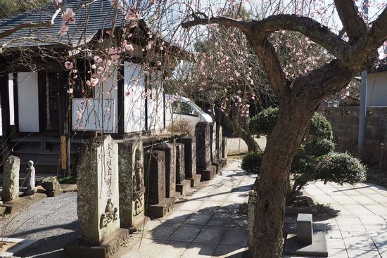 画面左の白壁は地蔵堂です。将門とその一門を弔う地蔵尊が祀られています。並んでいる石塔は