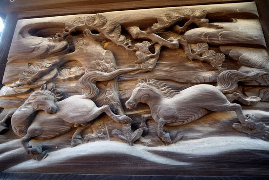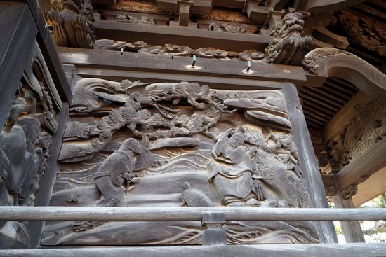 社殿左側の彫刻。翁と媼、鶴、亀、松の高砂の図柄。