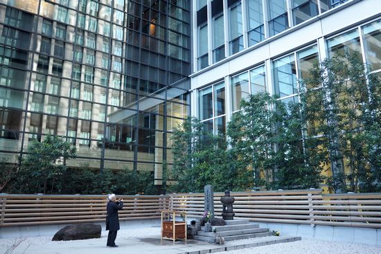 塚の後ろと横は、聳え立つ高層ビルです。塚の周囲は美しく整備されています。合掌。
