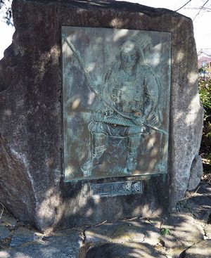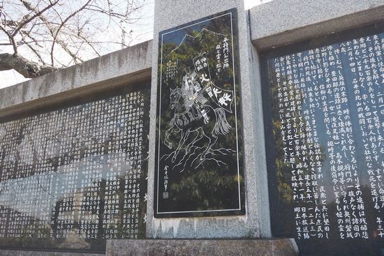 石碑中央部の絵は、大河ドラマ「風と雲と虹と」をイメージして描かれたとか。