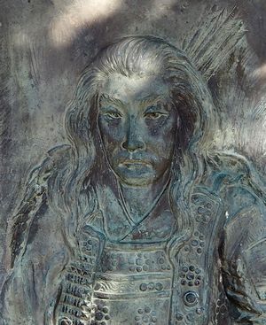 ここには将門公のレリーフもあります。写真左はレリーフの全体像。右は顔の部分のアップ。レリーフ