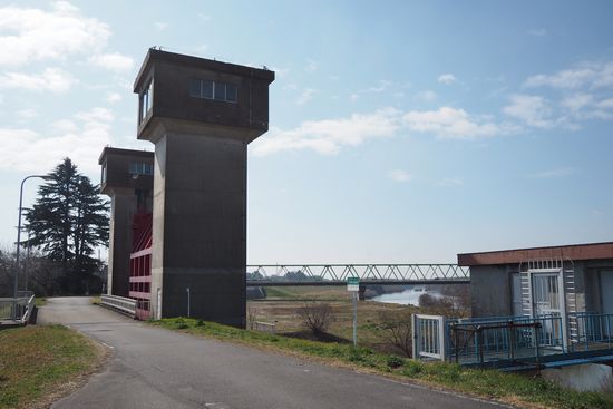八間堀水門です。八間堀川が鬼怒川に流れ込んでいる場所です。奥に見えている橋は、豊水橋