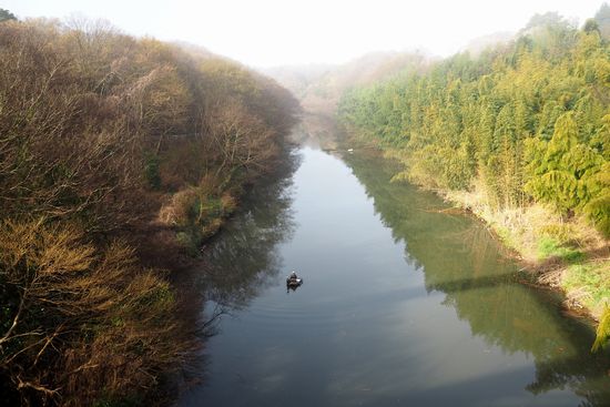 いつもの弁天橋から下流方向の景色。遠くはもやっています。