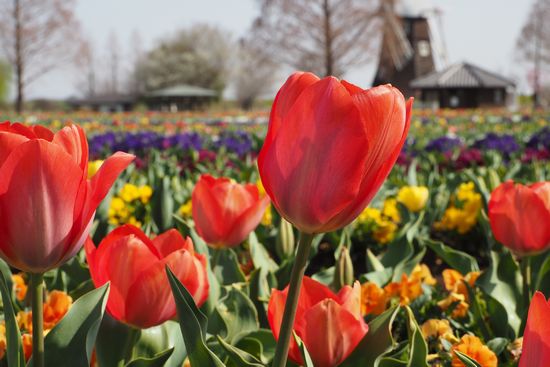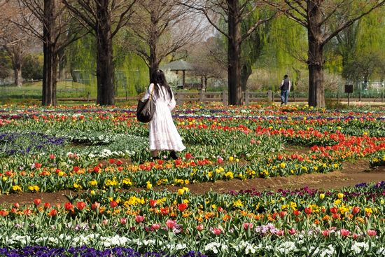 帰りに新大利根橋を渡って、あけぼの山農業公園に立ち寄りました。チューリップは一部咲きだした