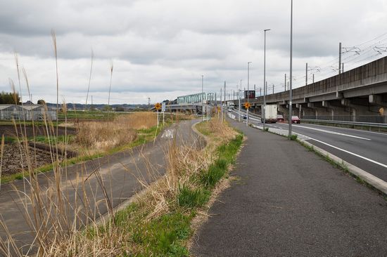 吉高交差点から長い坂を下りきると、側道が現れるので、そちらに移ります。やがてあんのう橋