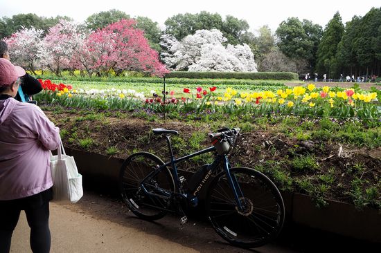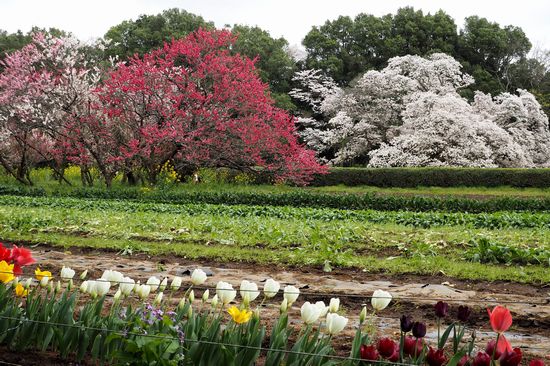 大桜に花桃。手前にはチューリップ。まさに春たけなわの風景です。惜しむらくは、曇天で青空