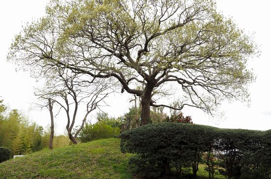 大桜近くに古墳(円墳)があり、頂上に樹が生えています。