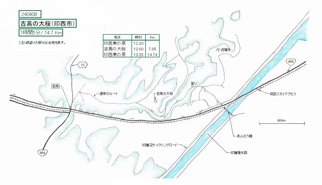 からR12から農道)は、人出が多い場合、走り難いし、歩行者に迷惑なので、地図にあるように、裏側から大桜に達するルートをとりました。