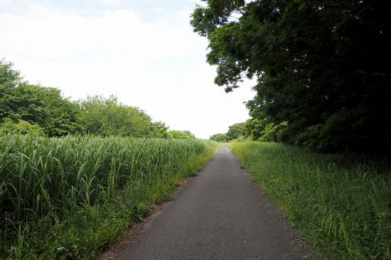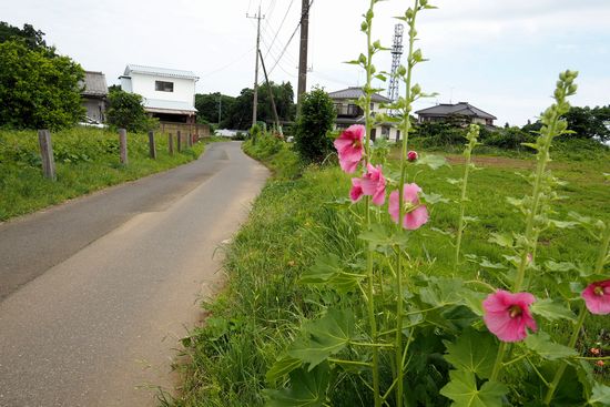 常総ふれあい道路から坂を登って、右側の台地の上に出ます。タチアオイの咲く道を進みます。