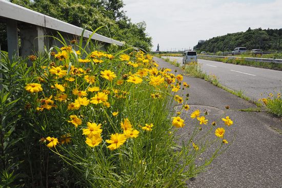 印西から国道464を東に向かいますが、道端に黄色いオオキンケイギクが、ずらっと並んで咲いて