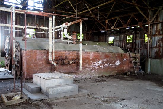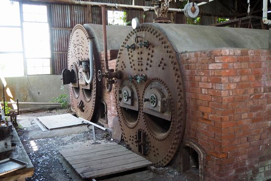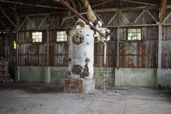 煙突のある建物は、旧汽缶場(ボイラー室)。中に入れます。