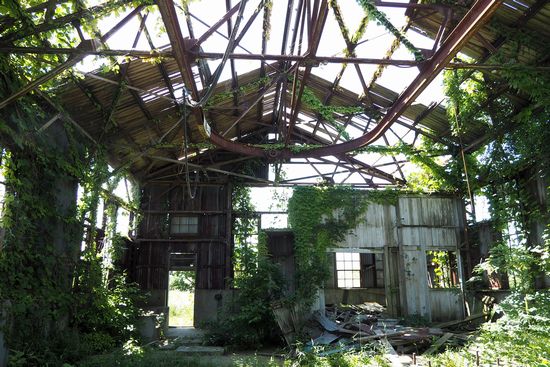 屋根も抜け落ちて骨組みだけ。 風の強い日に中に入ると、危ないですね。