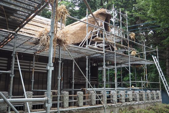 国王神社に立ち寄りました。1月に来たときと同じく、周囲にパイプの足場が組まれていて、茅葺の