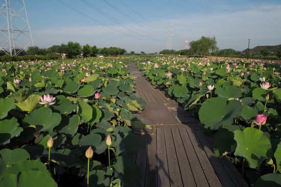 東西に長い蓮池の中央に木製の遊歩道が設けられています。