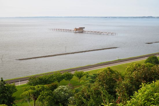 展望台からの眺め。霞ヶ浦大橋から土浦市街に至る水域(土浦入)と、霞ヶ浦大橋以北の水域(高浜入)