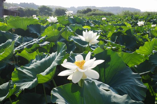 霞ヶ浦(西浦)の土浦入の北岸は、行けども行けども続く蓮田が印象的な所です。この時期、これら蓮田は花の季節を迎えています。鑑賞用の蓮