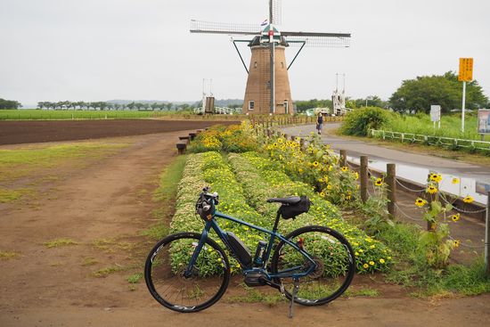 一応、ヒマワリを前景にして風車を撮ります。
