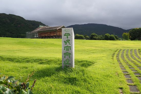平沢官衙跡の石碑です。暗い空を背景とし、この丘だけ陽射しを受けて、何やら印象的な風景