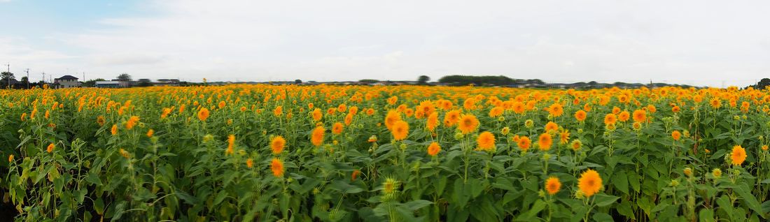あけのひまわりフェスタの会場に着きました。100万本と云われているひまわり畑を、パノラマモードで撮影しました、なぜ