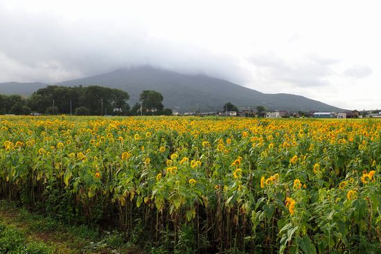 ひまわり畑と筑波山。頂上は雲の中。