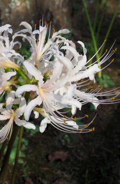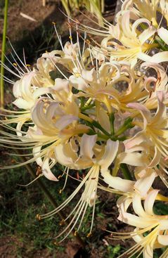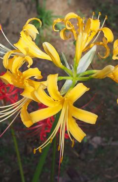 色の異なる彼岸花。左から、薄い黄色、白、黄色。