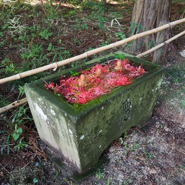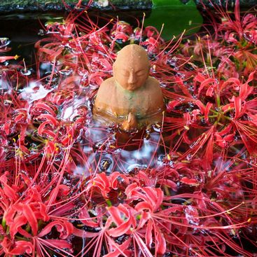 千姫の墓の前に置かれた花手水。水の中には三体の仏様がおられました。アップで仏様を撮ると、彼岸花が