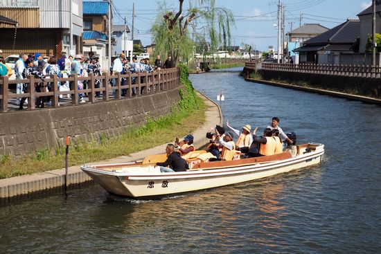 祭り見物で小野川水門から船で来た人が、源義経山車と遭遇し、歓声をあげています。