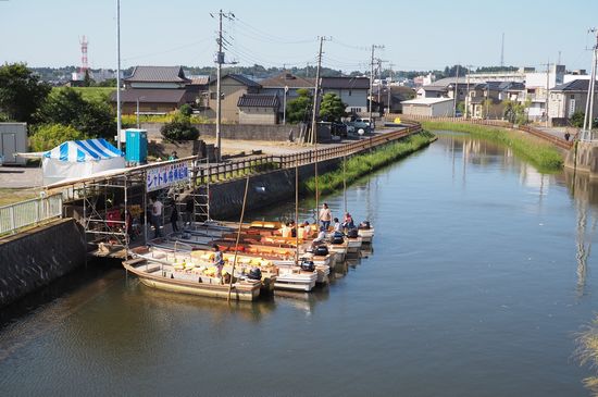 小野川河口の小野川水門から撮影。舫っている船で、祭り会場近くまで行けます。