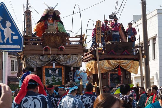 川沿いから街中に入ってみました。山車がたくさんありました。山車が2台、すれ違いました。左が