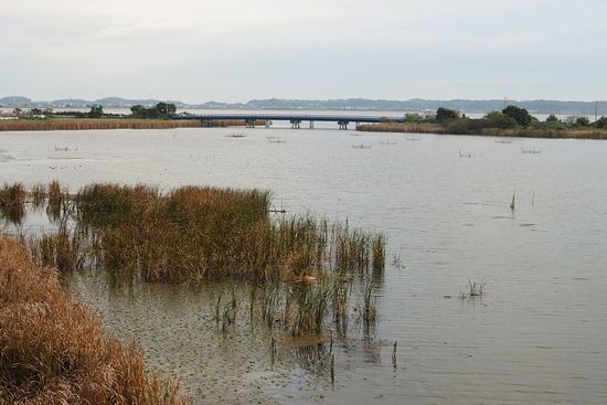 国道464からの北印旛沼。画面中央の橋は甚兵衛大橋です。このあたり、夏の間は、緑色の水草