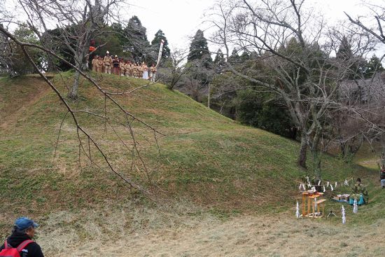 行列は、殿塚と姫塚の間を通過し、kれから殿塚(前方後円墳)の後円部に登ります。
