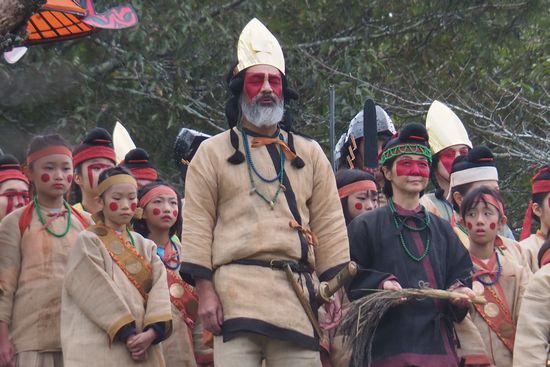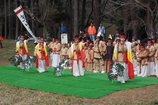 殿塚に着きました。芝山はにわ祭の幟を先頭に、古代人の行列がやって来ました。
