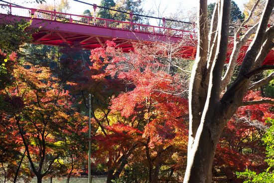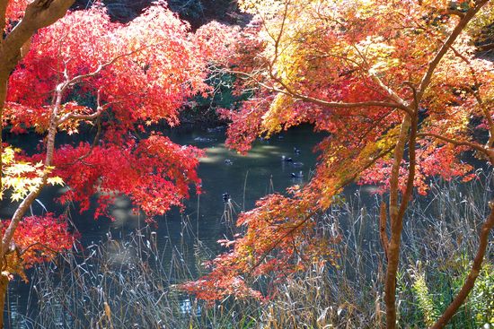 これは下の池の屈曲部にあるカラコギカエデ。濁りの無い真紅の紅葉は見事であります。