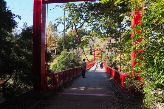 泉自然公園に着きました。駐輪場に自転車を停め、最初にやるべきは、この赤い吊り橋(いずみ橋)