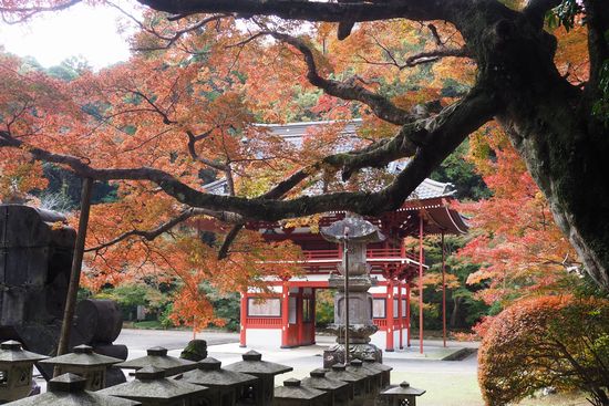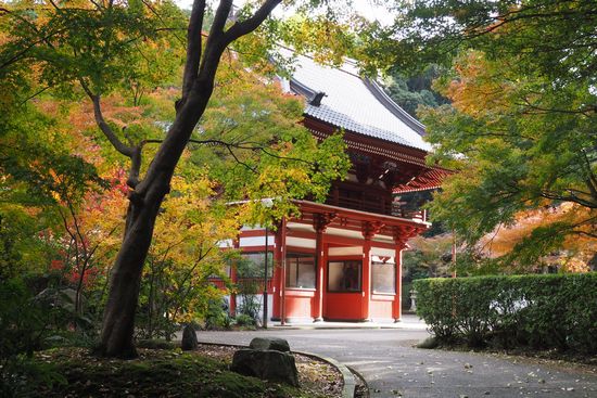 本堂左側からもみじ越しに仁王門を見る。