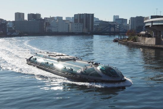 新大橋の上で休憩していたら、ディズニーシーのアトラクションに出てきそうな宇宙船もどきの船が
