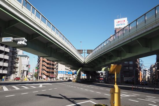 高架道が二つに別れていますが、右が産業道路、左が第一京浜です。ここに大森警察署前という